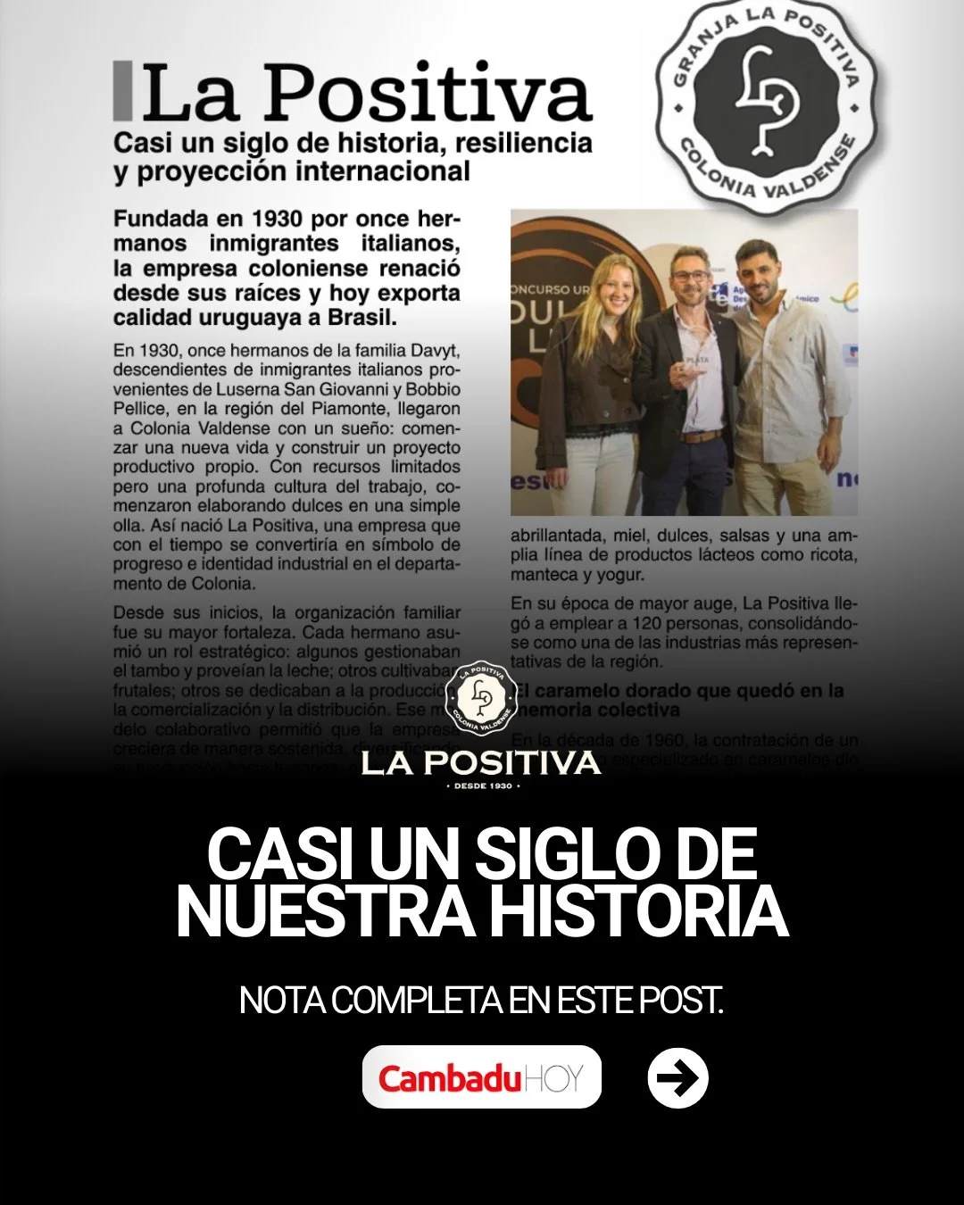 La Positiva nació en 1930, en la década dorada del Uruguay. Desde entonces, generaciones de una misma familia han mantenido vivo el propósito de sus fundadores: crear productos que combinen tradición, calidad y sabores que perduran en la memoria.
