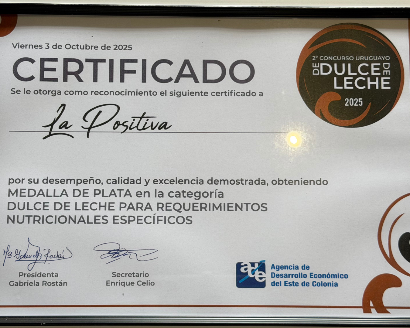 🥈 Certificado de Medalla de Plata — Dulce de Leche para Requerimientos Nutricionales Específicos · 2025 para nuestro Dulce de Leche Dietético.