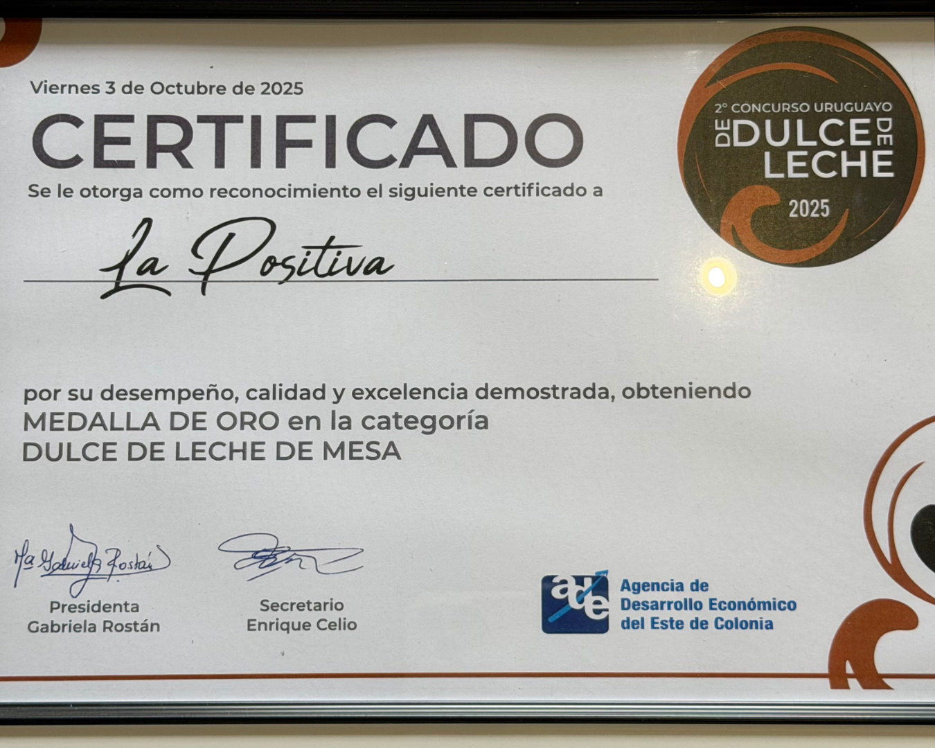 🥇 Certificado de Medalla de Oro — Dulce de Leche de Mesa · 2° Concurso Uruguayo de Dulce de Leche 2025 para nuestro Dulce de Leche Línea Premium y Clásico.
